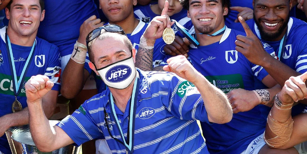 Greg Matterson (wearing the face mask!) has been the Newtown Jets head coach since 2008. His coaching record in the second-tier level of rugby league is second to none – two premiership titles, one interstate championship, two other grand finals plus five other finals appearances.
