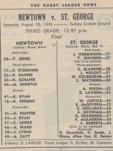 Fullback Ken Burnell had played first grade for the second half of 1942 but was graded in Thirds and spent most of the year before being called into second grade. Young Tom Jones took over for the finals and did a good job, even though he was built like a jockey. He would go on to play a few first grade games after the war.